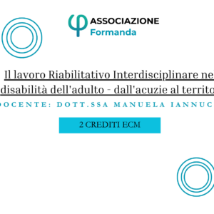Le Finalità del corso saranno illustrare il percorso riabilitativo interdisciplinare, che inizia nei reparti per acuti e prosegue con il rientro al domicilio grazie al supporto dei servizi territoriali per il cronico. Verrà evidenziato come l’intervento di più figure professionali, che mettono in atto il programma riabilitativo secondo una modalità interdisciplinare, permetta un lavoro più efficace ed efficiente per il paziente, gli operatori e il caregiver facilitando il raggiungimento degli obiettivi. Acquistando il corso accetti i termini e le condizioni di Formanda.org e sarai indirizzata/o alla pagina di registrazione e pagamento su ecomind.it la piattaforma e-commerce nostra partner. I tuoi dati saranno usati solo ai fini del corso e di database di Formanda.org In nessun caso ti verranno inviate mail o newsletter a meno che tu non dia il tuo consenso. Potrai chiedere la cancellazione del tuo account e dei tuoi dati in qualsiasi momento. Acquista il corso Acquista il corso Acquistando il corso accetti i termini e le condizioni di Formanda.org e sarai indirizzata/o alla pagina di registrazione e pagamento su ecomind.it la piattaforma e-commerce nostra partner. I tuoi dati saranno usati solo ai fini del corso e di database di Formanda.org In nessun caso ti verranno inviate mail o newsletter a meno che tu non dia il tuo consenso. Potrai chiedere la cancellazione del tuo account e dei tuoi dati in qualsiasi momento.
